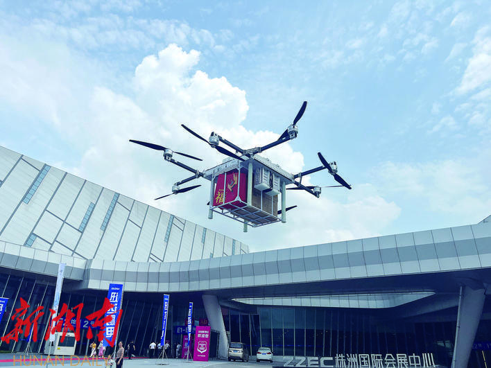 株洲国际会展中心前坪,携带着外卖的无人机即将降落。 株洲日报全媒体记者/潘东晓 摄
