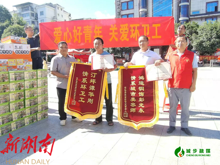 活动现场, 城步鸿运铜饰公司总经理彭光永、汀坪乡水果种植专业户谭华刚为县城170名一线环卫工人送上一份特别的关怀,发放价值3万多元 的爱心物资。一件件爱心礼物,承载着对环卫工人的深深敬意。致富不忘奉献,公益是他们回报社会的最好方式。他们表示,环卫工人是最可爱的人,夏天室外温度普遍35度,路面温度接近50度,像一块烧红的烙铁。可他们总是默默无闻地出现在马路上,挥舞着扫帚,挥洒着汗水,“脏了我一人,干净千万家”,这就是环卫工人平凡而又伟大的工作。