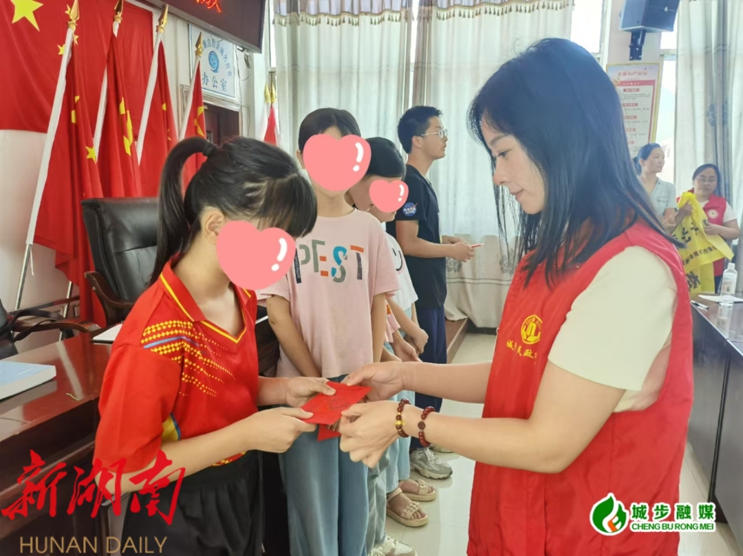 新城步客户端8月26日讯 (通讯员 彭春琳)爱心助学见真情,志愿服务暖人心。8月23日,城步苗族自治县慈善会、县民政局方圆社会工作服务中心党支部、社工总站为丹口、兰蓉、西岩、儒林的7名困境学子发放由江阴市慈善义工艺术团“牵手+萤光计划”捐赠的助学金7500元及行李箱。