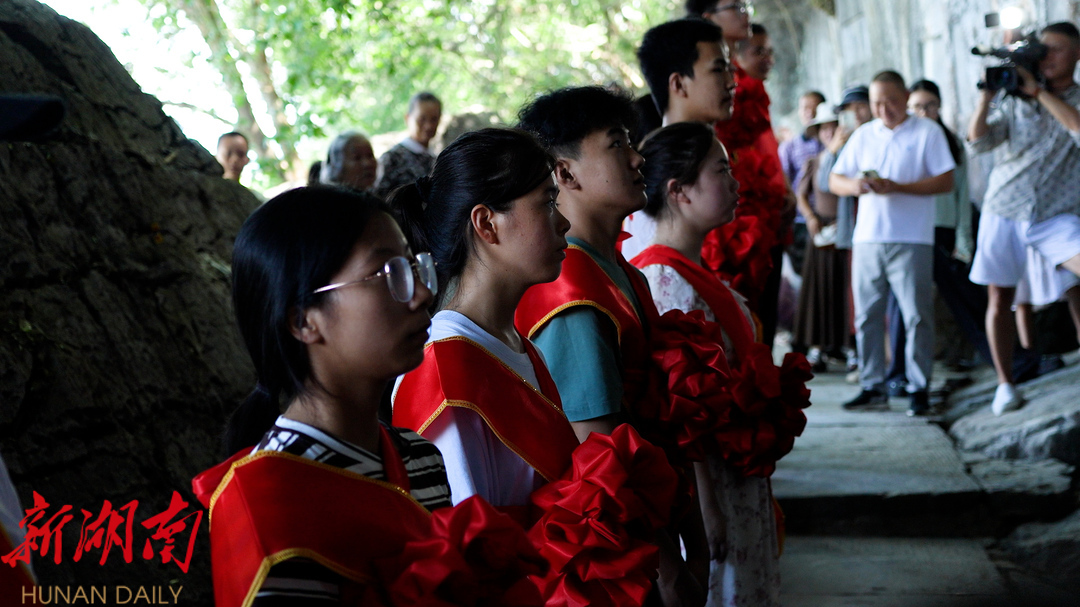 新江永客户端讯(记者 毛文涛 蒋军 ) 8月24日,在江永县上甘棠村“忠孝廉节”摩崖石刻前,12名今年考上大学的学子在乡贤的带领下,立下庄重誓言。