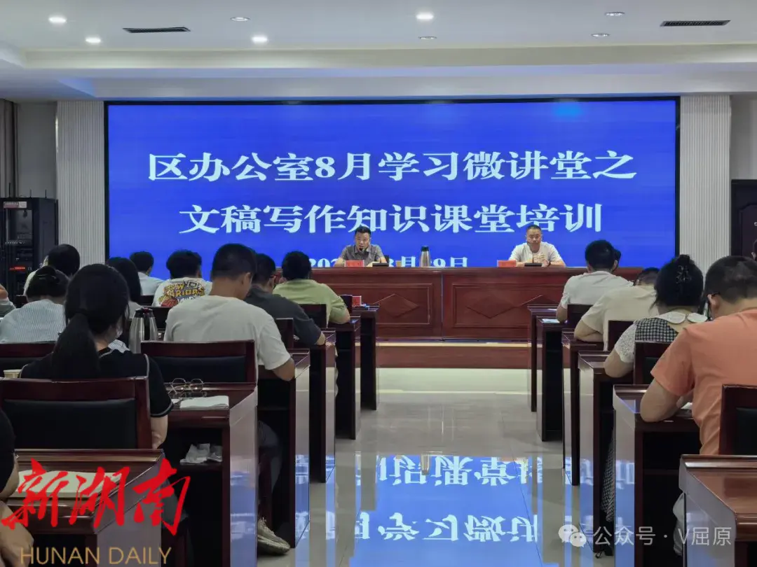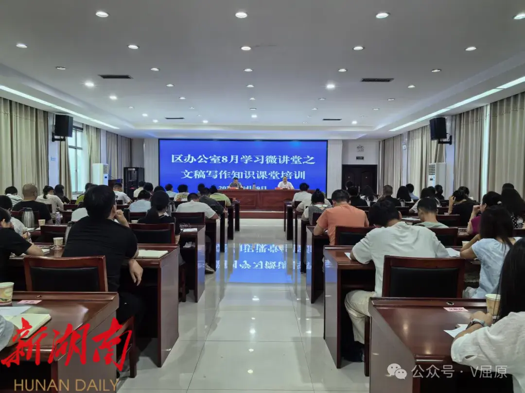湖南日报·新湖南客户端8月30日讯(通讯员 黄泳佳)为深入学习贯彻习近平总书记关于办公厅工作的重要指示,进一步提升全区机关干部综合文稿写作能力,8月29日,屈原管理区党委管委办公室举办“文稿写作知识”学习培训,特邀岳阳市人民政府研究室副主任张生根现场授课,区党委委员、区办公室主任彭典主持并讲话,各单位办公室主任及办公室相关干部、区办公室全体干部等90余人参加。