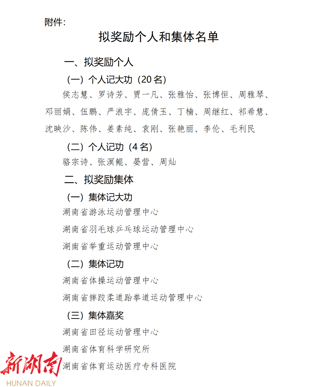 8月23日,湖南省人力资源和社会保障厅发布《关于湖南省参加第33届夏季奥运会奖励人员和集体的公示》(以下简称《公示》),包括侯志慧等4名奥运冠军在内的20名个人、3个集体记大功,另有4人、5个集体记功或嘉奖,公示至8月29日结束。