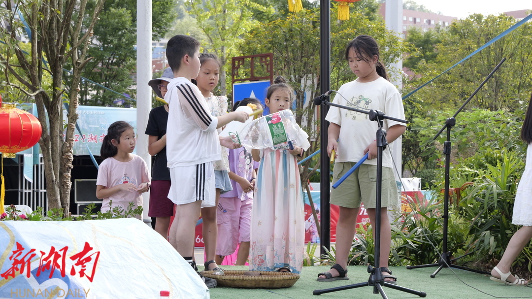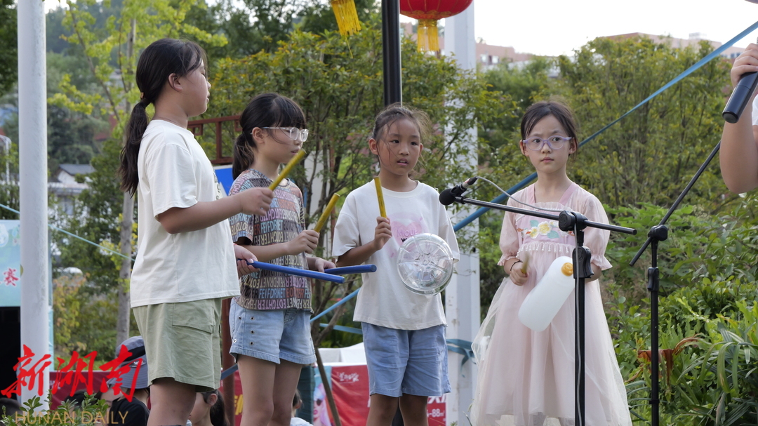 “又有好久对门伢儿哥,没唱歌来妹儿呀喂......”《又有好久没唱歌》《歌盼红军》《啄棒歌》三首歌曲联唱让现场观众沉浸其中,舞台上,孩子们手持各式各样的“乐器”配合演唱,牛铃铛模拟清脆的铃声,筛子与黄豆模仿徐徐风声,木棍轻击碰撞出独特的节奏感......这些简单却充满创意的伴奏,与孩子们纯净的歌声完美融合,展现出桑植民歌独有的韵味。
