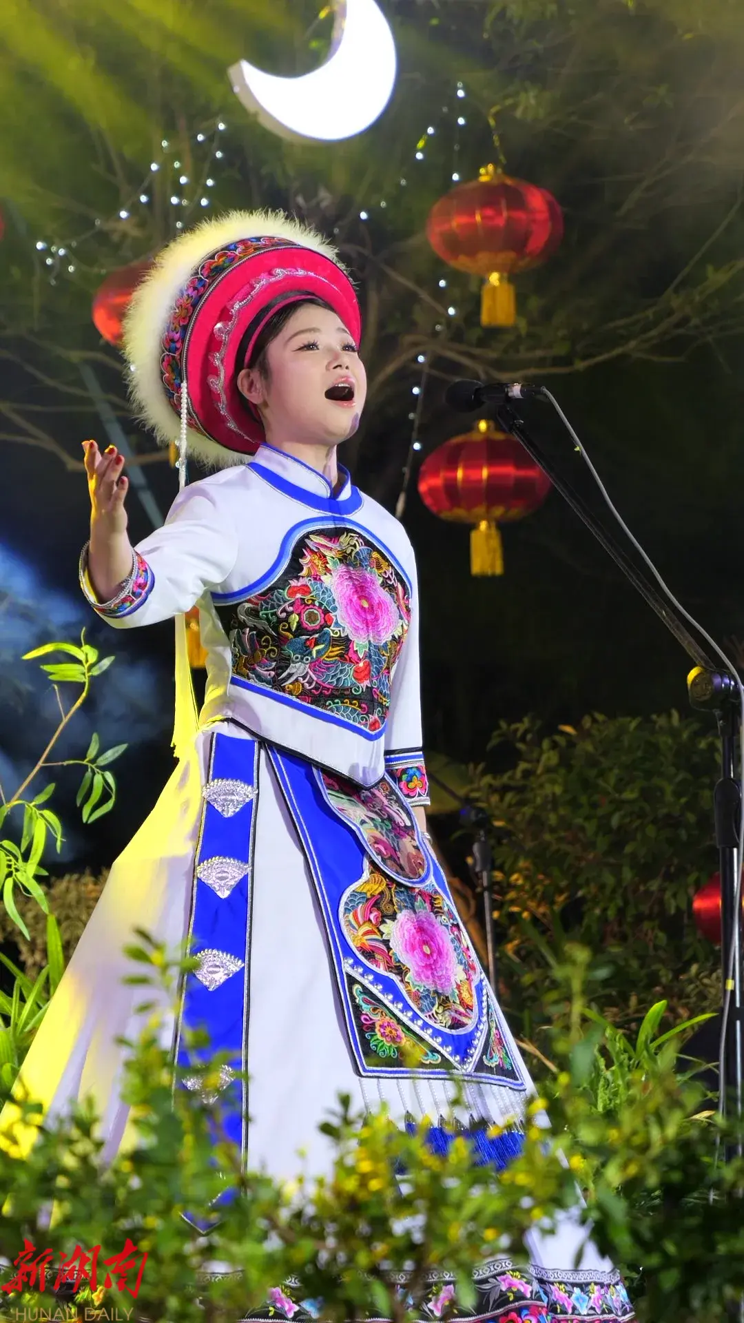 当晚,刘剜廷身着精美的白族服饰,帽檐的羽毛随微风轻轻摇曳。当她开口唱出《洪家关》的第一个音符,整个比赛现场仿佛被一股无形的力量所包围,所有人都被她深情的演唱深深吸引。她的歌声清澈如泉,一曲《洪家关》高亢激昂、情感充沛,仿佛带领听众回到那个烽火连天的年代,感受桑植儿女那份坚韧不拔、勇往直前的革命精神。