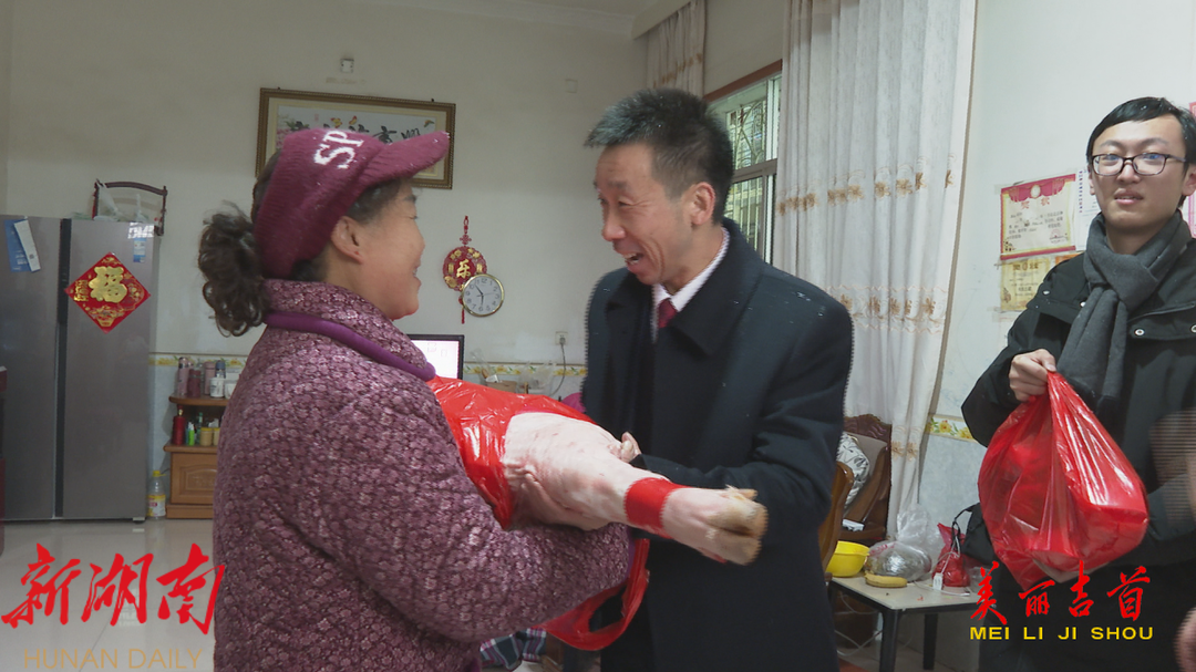 湘西州委常委、吉首市委书记周立志为小溪桥安置区爱心居民送上过年物资。吉首融媒记者 张远思摄
