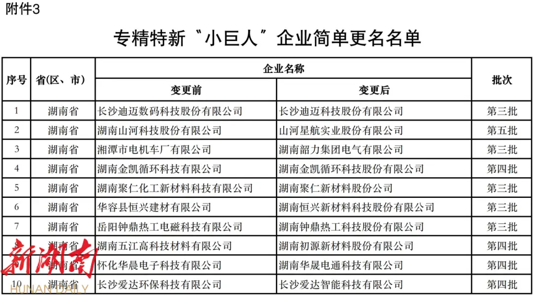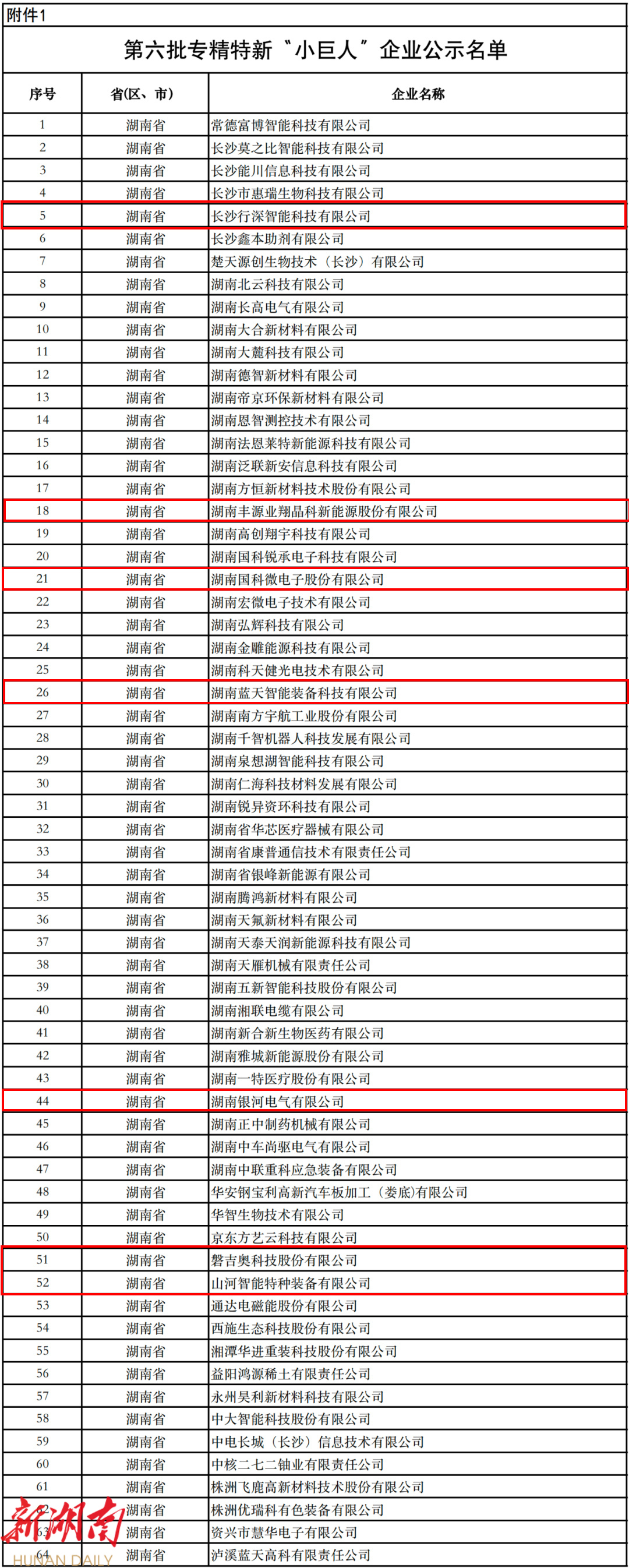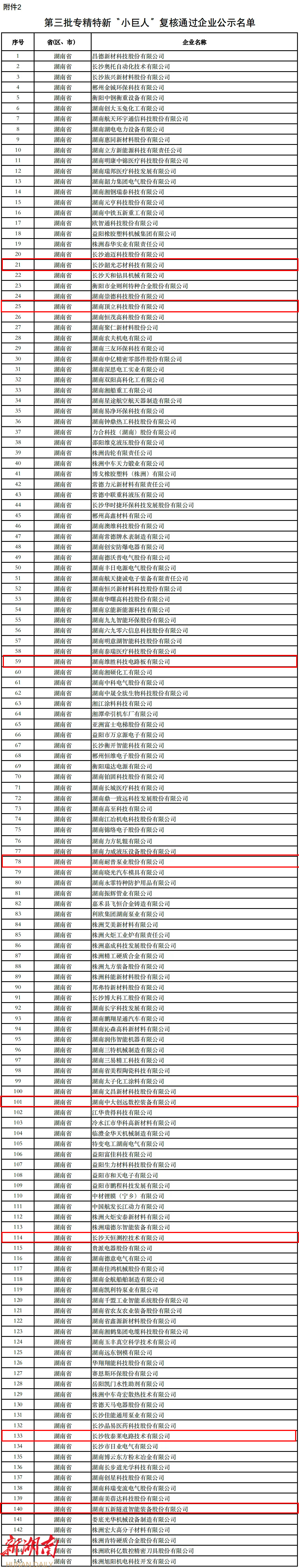 湖南日报·新湖南客户端9月3日讯(长沙经开区工作站记者 欧亚琦) 近日,工信部发布第六批专精特新“小巨人”企业和第三批专精特新“小巨人”复核通过企业公示名单,长沙经开区有7家企业入围第六批专精特新“小巨人”企业名单,8家企业通过第三批专精特新“小巨人”复核,公示名单如下:
