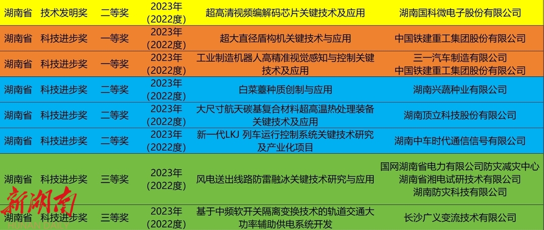 在2022-2023年度湖南省科学技术奖励名单中,长沙经开区有8家企业获奖,分别为湖南国科微电子股份有限公司、中国铁建重工集团股份有限公司、三一汽车制造有限公司、湖南兴蔬种业有限公司、湖南顶立科技股份有限公司、湖南中车时代通信信号有限公司、湖南省湘电试研技术有限公司、长沙广义变流技术有限公司。