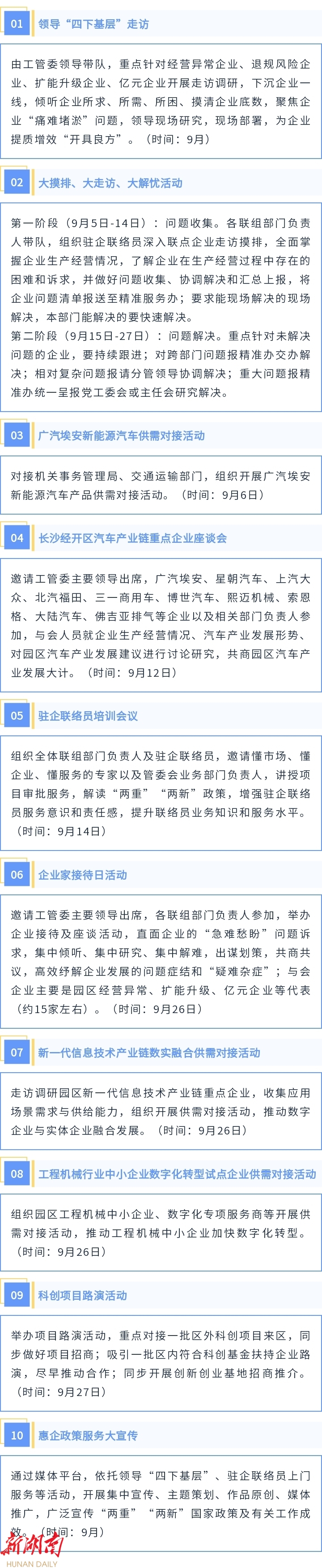 专项行动涉及领导“四下基层”走访、广汽埃安新能源汽车供需对接活动、长沙经开区汽车产业链重点企业座谈会、企业家接待日活动等10项涉企服务内容,具体如下: