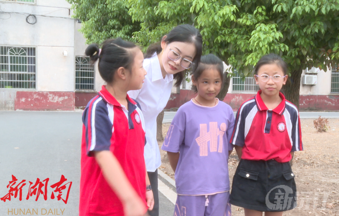 在沅江市南大膳镇中心小学花园里,胡妙君与几名学生围在一起畅谈学习与生活,用心倾听他们的心声,感受他们的烦恼与欢愉,与他们一起悲伤、一起快乐、一起成长,用陪伴来获得学生们的认可。