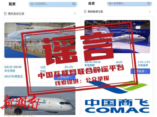详情: 近期,有不法分子假冒中国商飞名义制作虚假网站及虚假理财APP,并在其中发布“中国商飞购买股权产品赠黄金”“中国商飞养老金”等虚假投资理财项目。对此,中国商用飞机有限责任公司9月9日发布声明表示,未授权或利用其他网站、APP、微信公众号、微博等线上形式以“中国商飞”“C919”“ARJ21”“C929”的名义销售投资理财产品,也从未组织开展任何线下投资理财推广活动;提醒相关个人或企业在收到任何可疑邮件或短信时,请勿点击其中包含的链接或附件,切勿按照对方要求实施任何形式的支付行为,避免造成财产损失。(来源:“中国证券报”微信公众号)