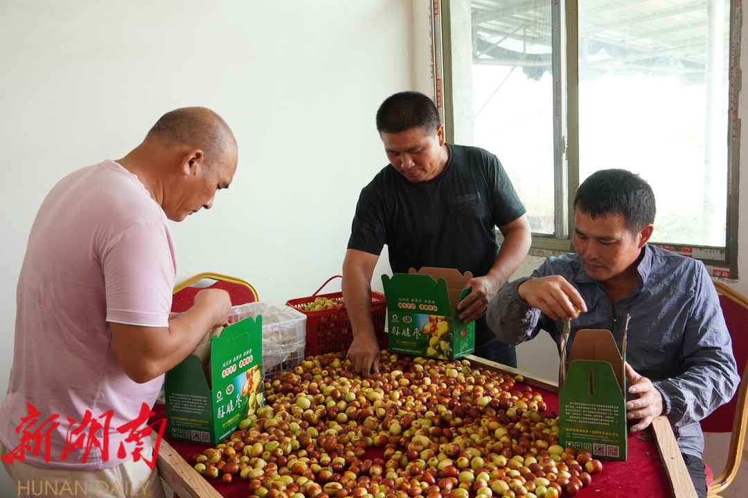 新新邵客户端9月10日讯 金秋时节,瓜果飘香。眼下,位于新邵县酿溪镇王家坪村萝卜园种养基地的100余亩酥脆枣开始成熟上市,一颗颗圆润饱满的脆枣挂满枝头,村民们穿梭在枣树间忙着采摘成熟的酥脆枣,准备发往客户手中。