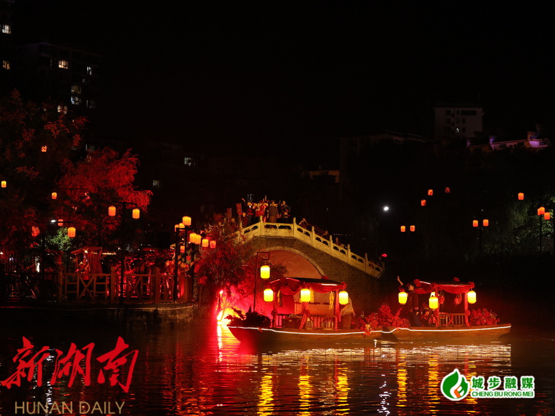 乘船于江渚之上,灯影交织处,凉风习习入清秋。《巫水河边月正圆》全国首个水上苗乡数字幻游是一次将“行船游赏”“数字光影”“沉浸式情感交互剧场”深度融合的水上夜游项目。船随戏走,戏在河上,在2.6公里的巫江夜游项目里,嘉宾们在船上吹着凉风,化身苗家阿哥阿妹亲历一场巫水河边的“归乡探秘之旅”,在虚实之间感受城步的民俗文化之美、生态锦绣之美、英雄根脉之美。