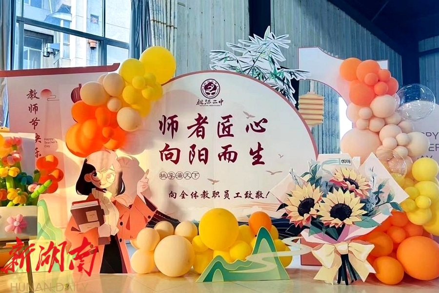 为庆祝第40个教师节,营造浓厚的尊师重教氛围,让教师们度过了一个温馨而难忘的节日。桃源县第二中学 党委、行政、工会、团委积极筹划、精心布置、别出心裁,给了老师们一个大大的惊喜。午餐时间,该校相关负责人、全体班子成员手捧鲜花,早早地在教师食堂门口等候,迎接前来就餐的老师们。一声声“辛苦啦,节日快乐!”伴随着芬芳的鲜花,让老师们在踏入食堂的第一时间就感受到了温暖和祝福。随后,教师们走进食堂,眼前是学校精心布置的教师节气球和鲜花,上面写满了对老师的崇敬和感谢之情。教师们在《感恩的心》的旋律中轻松愉快的享用着学校精心准备的水果和美味菜肴,学校班子和教师欢聚一堂,共进午餐,庆祝活动简洁而温馨。通过这种仪式感满满的庆祝活动,不仅让教师们感受到了职业的幸福和快乐,也进一步增强了学校与教师之间的感情,营造了尊师重教的良好氛围。