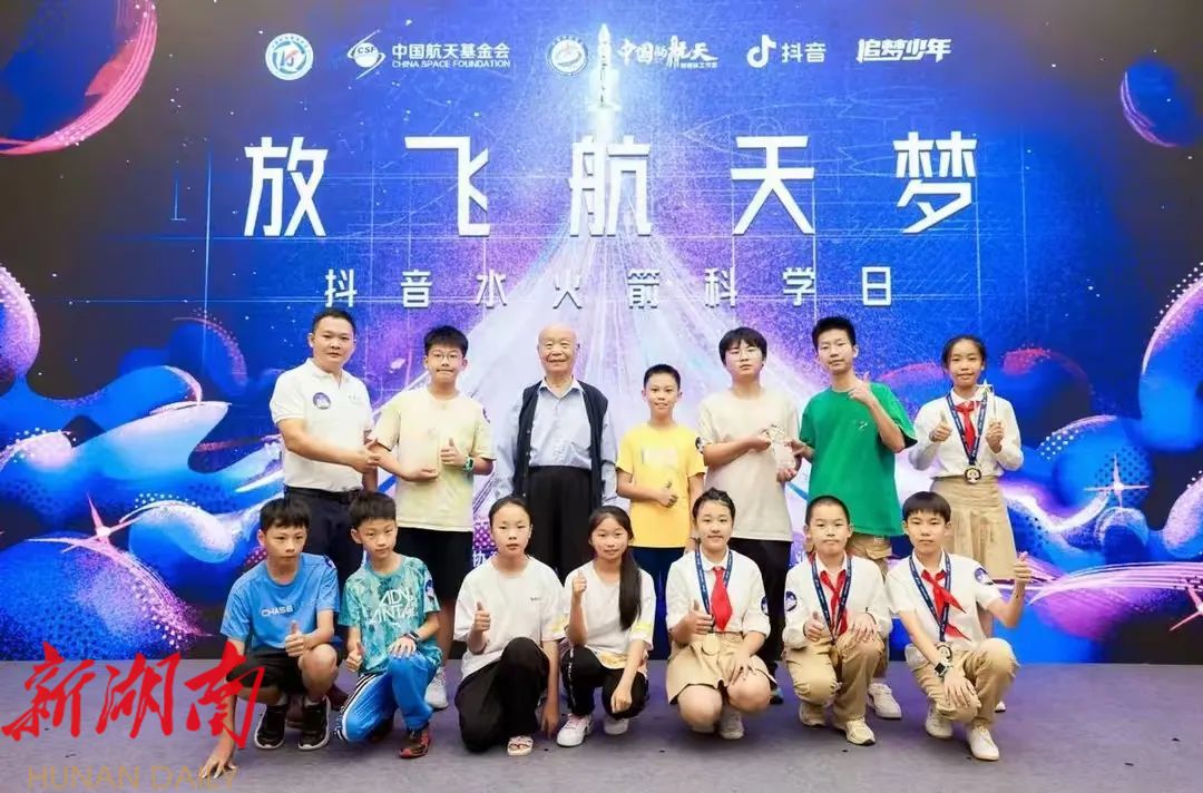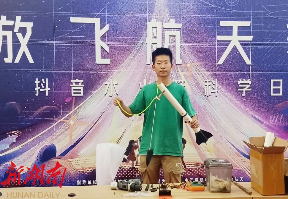 新新邵客户端9月12日讯 “中国少年的火箭太燃了”“为航天埋下了一颗种子”……近日,来自全国各地的青少年和科技爱好者汇聚北京亦庄,参加“水火箭科学日”暑期科普活动,来自新邵二中的17岁少年张世杰受邀参加了本期科普表演赛,并在活动现场成功发射了一枚自制的“火箭”。92岁的液体火箭发动机和工程热物理专家、中国科学院院士庄逢辰也出现在现场,为“火箭少年”颁奖。