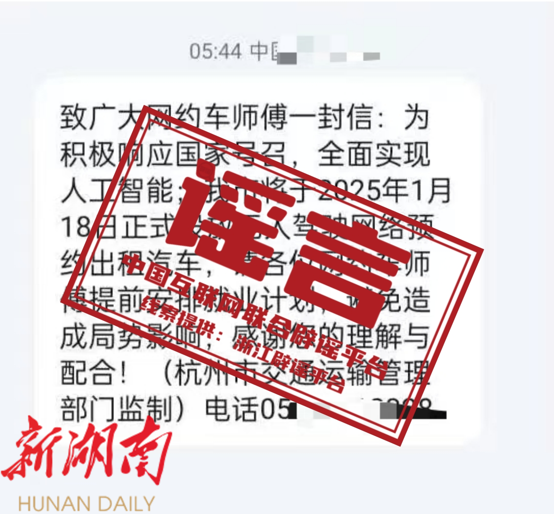 真相: 9月13日,网传一则冒用杭州交通运输部门名义发送的虚假信息,内容为“致广大网约车师傅一封信:为积极响应国家号召,全面实现人工智能;我市将于2025年1月18日正式投放无人驾驶网络预约出租汽车,请各位网约车师傅提前安排就业计划,避免造成局势影响,感谢您的理解与配合!(杭州市交通运输部门监制)电话12328”。经查,该信息为谣言。杭州市有关部门已开展调查处置。(来源:浙江辟谣平台、“杭州交通”微信公众号)