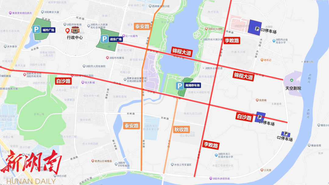 3.若从浏洪高速浏阳西高速路口或金阳大道入浏,可沿西北环线行驶至道吾山路,最终到达浏阳市行政中心北停车场。