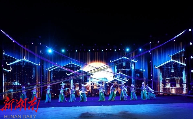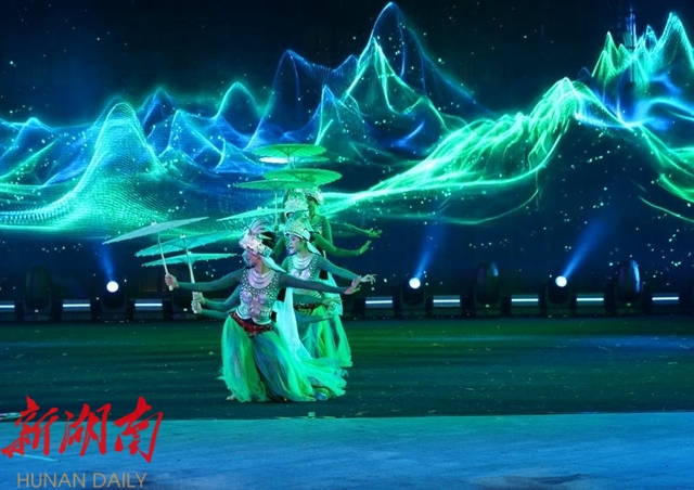 《一念梅山梦》共有天赐梅山、播厥百谷、紫鹊归来、生生不息、星辰永耀五个主题画卷。在时光的长河中,主题画卷缓缓展开一幅壮丽的长卷。在“天赐梅山”画卷中,仿佛是大自然慷慨的馈赠,梅山的秀丽风光如诗如画,山峦起伏,云雾缭绕,那是上天赐予的绝美画卷。“播厥百谷”画卷展现出大地的丰饶与人们的辛勤耕耘,金色的田野中,麦浪翻涌,播种的希望在这片土地上生根发芽。“紫鹊归来”画卷中,灵动的紫鹊带来祥瑞之气,它们在天空翱翔,为这片土地增添了一抹生机与活力。在“生生不息”画卷中,仿佛生命的力量在这里涌动,从潺潺的溪流到茂密的森林,从忙碌的人群到欢跃的动物,无不彰显着生命的顽强与延续。而“星辰永耀”画卷展现在黑暗的夜空中,星辰依然璀璨夺目,它们如同永恒的守护者,照亮着这片充满故事的大地,让希望与梦想永远闪耀。演员通过舞台艺术由风情衍化情感,由情感透射文化,将艺术的观赏性、旅游文化的娱乐性,与世界对话的融通性有机贯通,给现场嘉宾呈现别具特色的视听画卷,演绎美轮美奂的“梅山现象”。