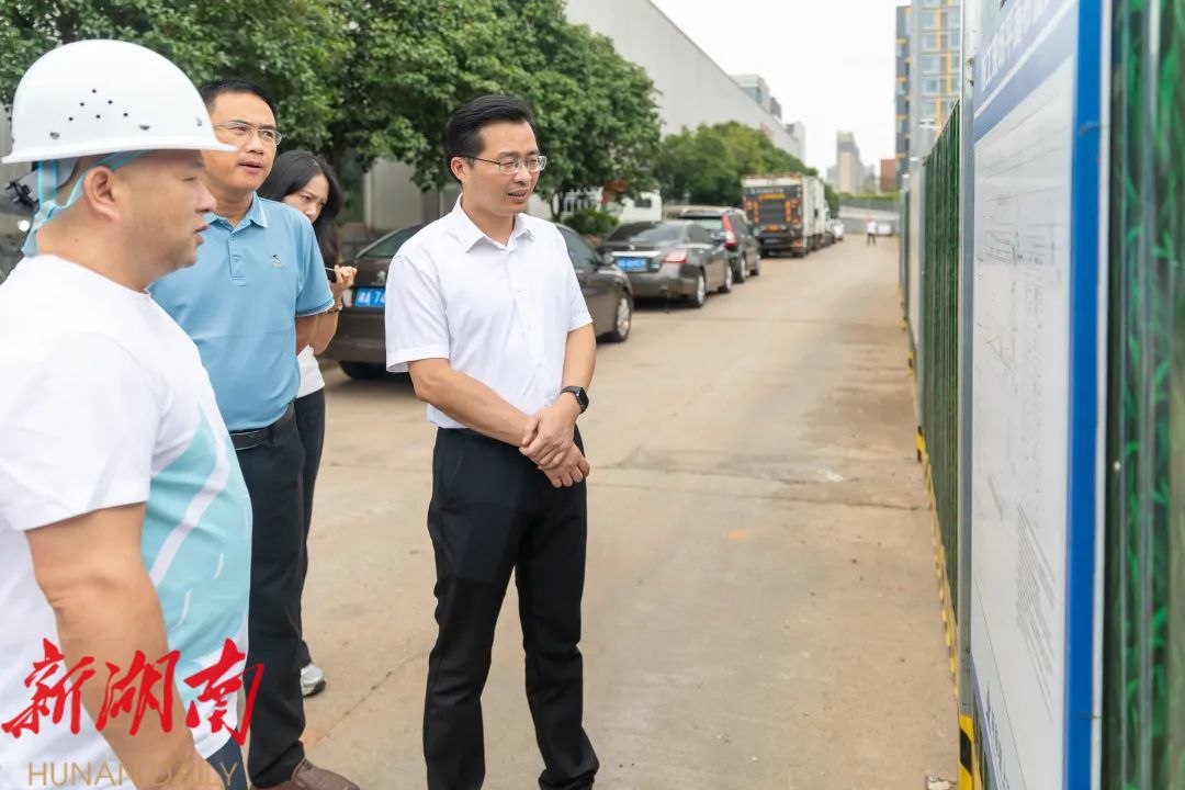在湖南汉升机器制造有限公司新建厂房项目,蒋红波现场查看设计图纸,询问项目进程,了解厂区规划等情况。他强调,要坚持高质量建设、高水平管理,安全施工、文明施工,抢抓项目建设进度。
