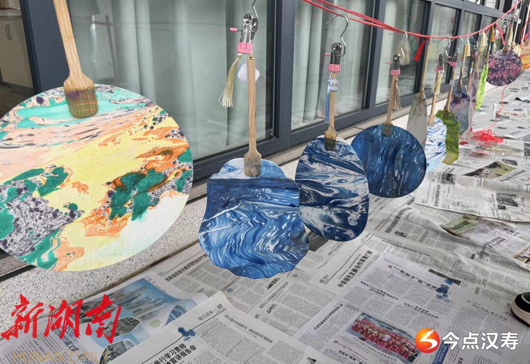 在漆扇创作过程中,干部职工认真挑选漆液的颜色,小心翼翼地滴入水中,随后轻轻搅动。多种颜色的大漆漂浮在水面上,交织形成独特的花纹,一把把白色的扇子浸入漂漆中,当漆扇从水中拿出的那一刻,大家不禁感叹,简约而不简单的漆扇,展示着中华优秀传统文化的独特魅力。