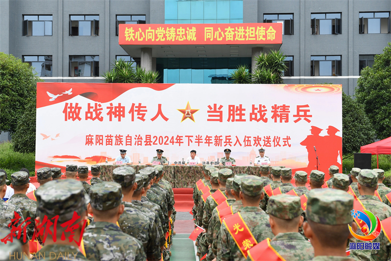 9月14日上午,麻阳苗族自治县2024年下半年新兵入伍欢送仪式在县人武部隆重举行,55名新兵身披绶带、胸戴红花,即将告别家乡和亲人奔赴火热军营,踏上从军报国、守卫边疆的新征程。县委书记、县人武部党委第一书记江涛出席欢送仪式并讲话,他强调 要深入学习 贯彻党的二十届三中全会精神和习近平 强军思想,毫不动摇坚持党对人民军队的绝对领导,忠实履行党和人民赋予的使命任务,坚定不移听党话、跟党走,不断开创国防建设与经济社会发展互促共进新局面。县人武部领导邱志、胡洪春出席。