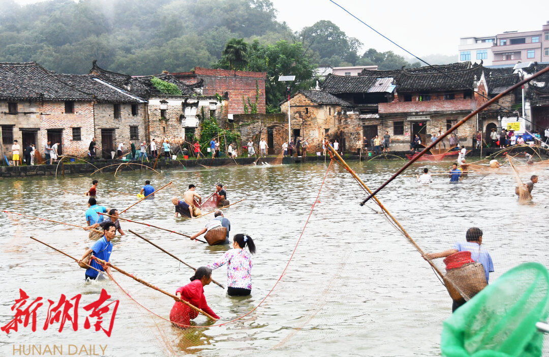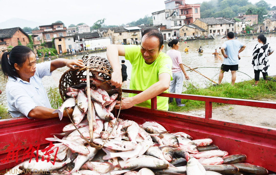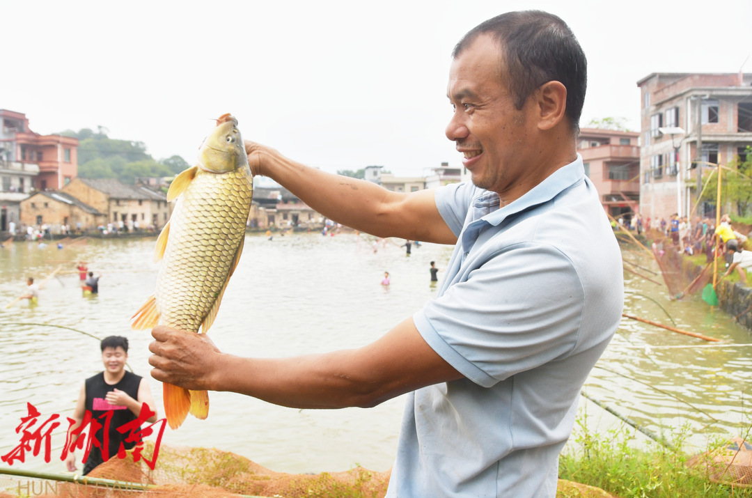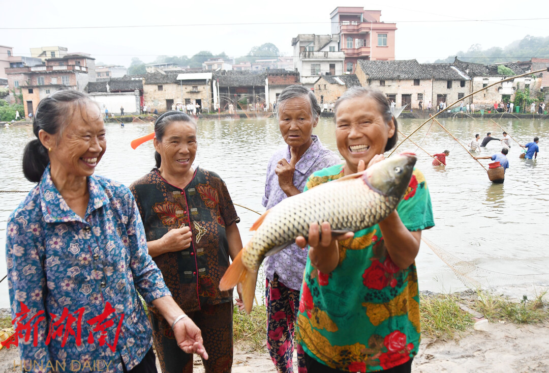 新江永客户端讯(记者 毛文涛 通讯员 田如瑞 ) 9月16日,上江圩镇夏湾村的池塘里人欢鱼跃。每年农历八月十四是该村的捕鱼节,一大早,全村男女老少带着各式各样的捕鱼工具直奔池塘。村民们有的夫妻协助,有的兄弟搭配,拿着渔网在鱼塘里拖网,希望捕到大鱼,预示来年风调雨顺,庄稼丰收,趣味十足的捕鱼活动也吸引了附近村民前来观看,人潮涌动,格外热闹。
