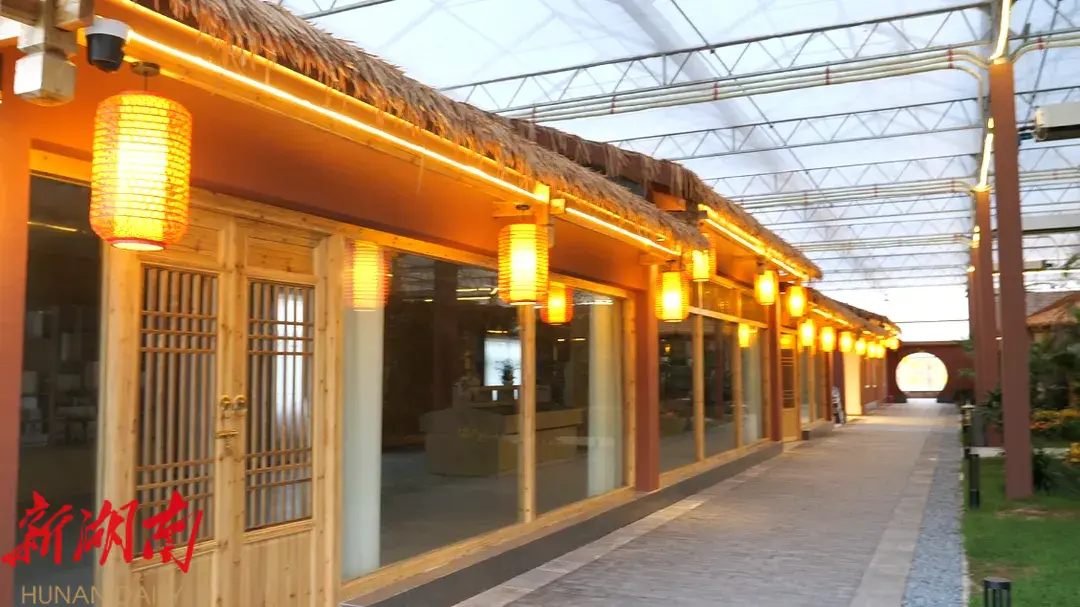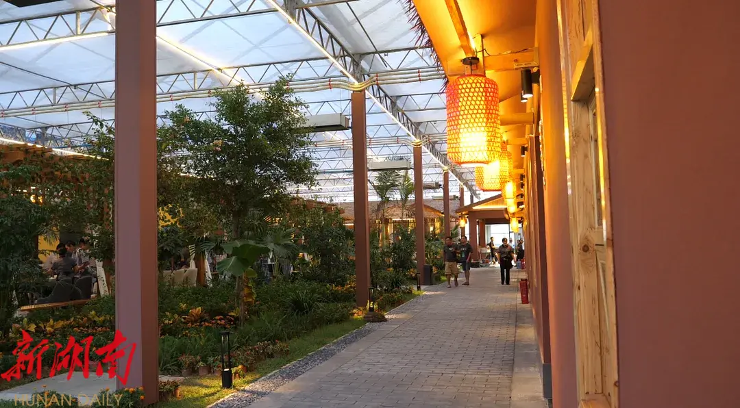 从洪家关游客服务中心往主会场方向前行100多米,就来到了大棚餐厅,连接两地之间的马路全新提质升级后,蓝色的游步道犹如一条蓝色丝带般镶嵌在翠绿山林间。大棚餐厅四周临湖,最多可容纳近400人就餐,结合了温室大棚和生态露营元素的概念,内部设置了植物、水体、山石等各种生态景观,营造出一种自然生态的氛围,让游客在享受美食的同时,亲近自然,感受生态的魅力。