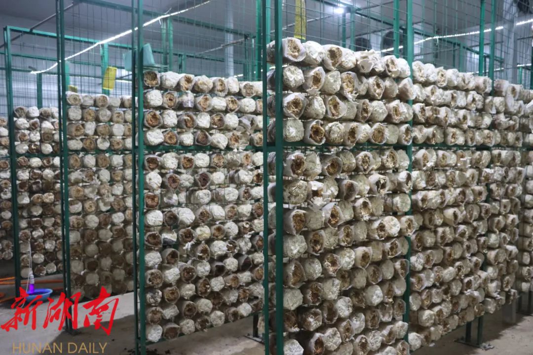 在位于南岳村的新邵县瑞萌农业蘑菇基地的菌包生产车间,机器轰鸣,装袋机飞速运转,工人们正抓紧时间生产秀珍菇菌包。不一会儿,一个个菌包整齐摆放在铁架上,等待着运往蒸汽灭菌车间。