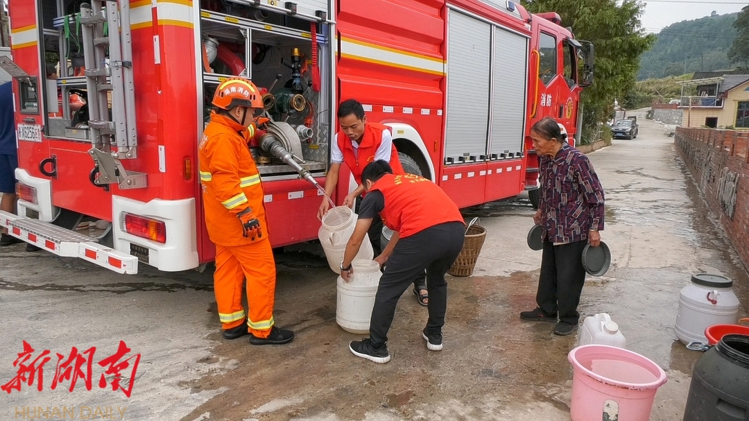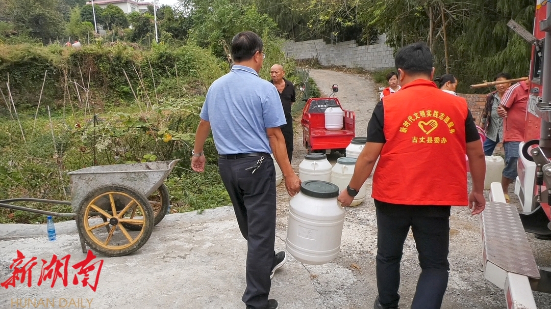 新湖南客户端9月26日讯(见习记者 余思颖)近期,受持续高温干旱影响,湘西土家族苗族自治州古丈县断龙山镇部分村民生活用水受到影响。为确保村民生活用水不中断,9月26日,古丈县委办联合古丈县消防救援大队,前往断龙山镇米多村,组织志愿者给村民义务送水。古丈县委常委、县委办主任郑良武一同前往。