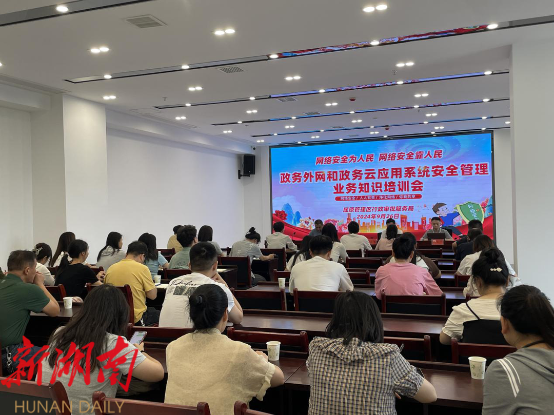 湖南日报·新湖南客户端9月27日讯(通讯员 李登高) 为进一步加强政务外网和政务云应用系统安全管理,避免发生政务数据安全事件,营造安全稳定的政务营商环境, 9月26日,屈原管理区行政审批服务局邀请岳阳市数据局安全运营中心负责同志和技术工程师开展政务外网和政务云应用系统安全管理业务知识培训,全区40余家相关单位、51名政府工作人员与会。