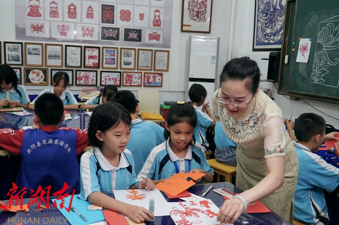 新新邵客户端9月27日讯 九九重阳,岁岁安康。9月26日,在新邵县思源实验学校的剪纸社团课上,新邵县非遗剪纸艺术传承人马丽娅老师和同学们一起创作“重阳节”主题剪纸作品,共庆重阳佳节的到来。