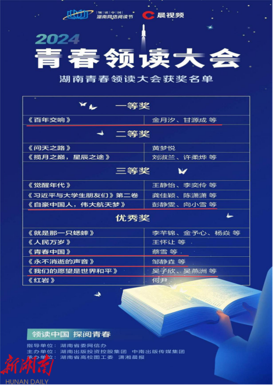 雨湖新闻网讯 (通讯员 孟莹 何姿慧)近日,笔者从潇湘晨报获悉,湖南科技大学在第五届湖南青春领读大会上荣获佳绩:由商学院 金月汐、甘源成等同学演绎的 朗诵 作品《百年交响》荣获本次“青春领读大使”评选一等奖 , 继2023年摘取“青春领读大使”后再次获此殊荣 ; 由马克思主义学院彭静雯、秦导、 向小雪 等同学的原创朗诵作品《自豪中国人,伟大航天梦》荣获 本次“青春领读大使”评选 三等奖;人文学院蒋拓峰、蔡雪、李烨的作品《永不消逝的声音》,人文学院蒋拓峰、蔡雪、周芳琳、王鑫阳的作品《青春中国》,商学院吴子欣、吴燕洲的朗诵作品《我们的愿望是世界和平》 等 3 个作品荣获本次 “ 青春领读大使 ” 评选优秀奖 。