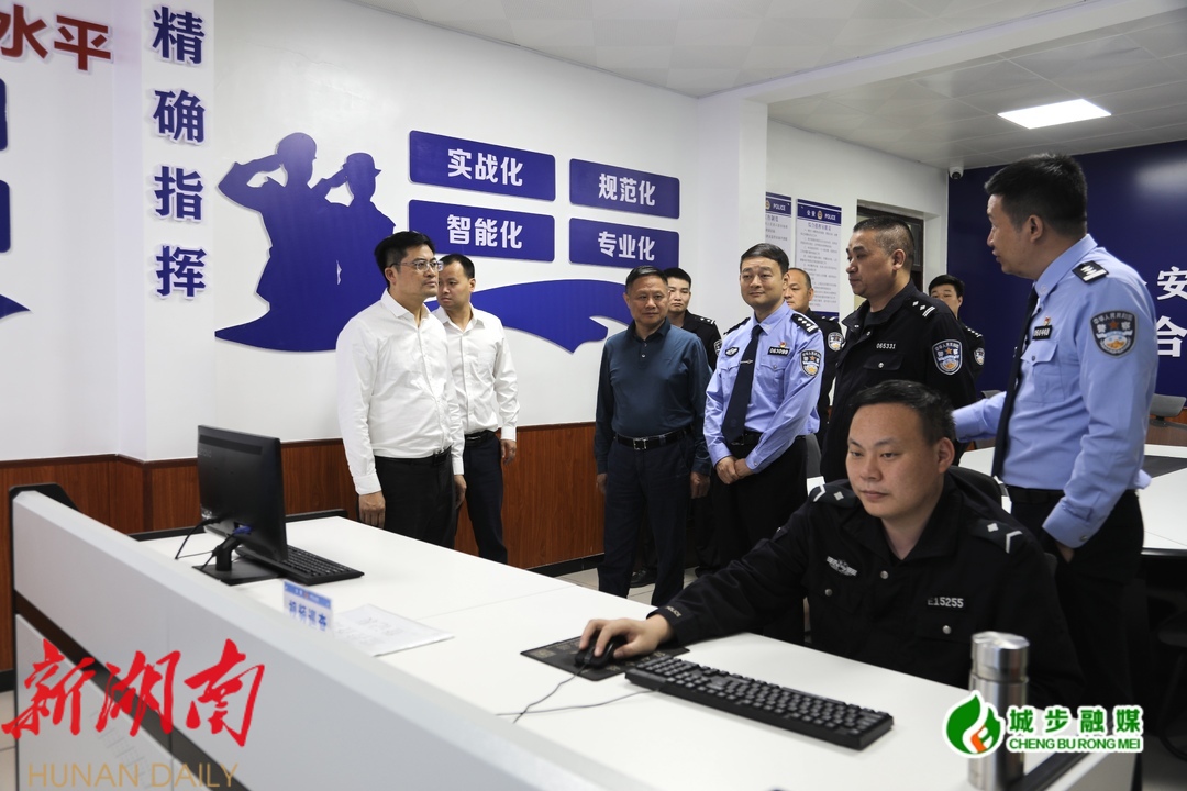 图为县委书记余勋伟一行在县公安局儒林派出所了解工作人员值班值守等情况