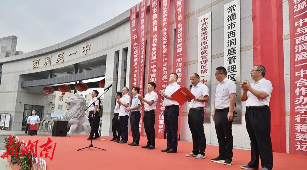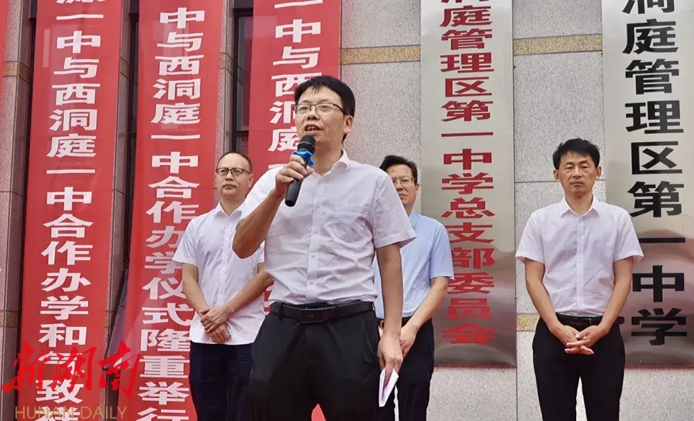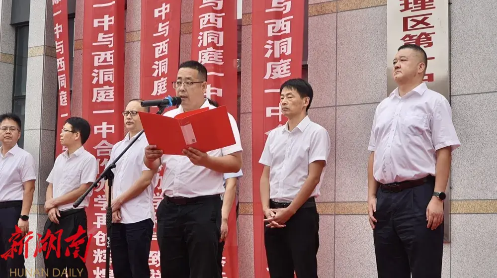 活动中,区一中负责人向出席揭牌仪式的各位领导、家长、老师、同学们表示衷心的感谢,并就合作办学相关情况进行了详细介绍。在新一轮合作办学期间,两校将围绕深化结对帮扶,打造全市普通高中结对帮扶样板和示范的这一主题,在管理指导、教师和学生交流、教学资源共享等方面持续开展深度交流协作,力争通过新阶段的努力,在巩固现有合作办学成果的基础上,结合实际融汇贯通,形成适合西洞庭一中校情的特色办学经验和教育教学模式,推进教育教学质量再上新台阶,为实施“三大战略”、开展“三大行动”,建设和美西洞庭贡献更多教育力量。