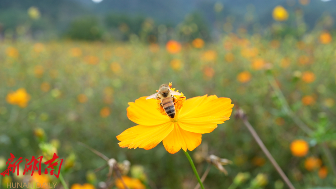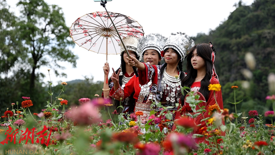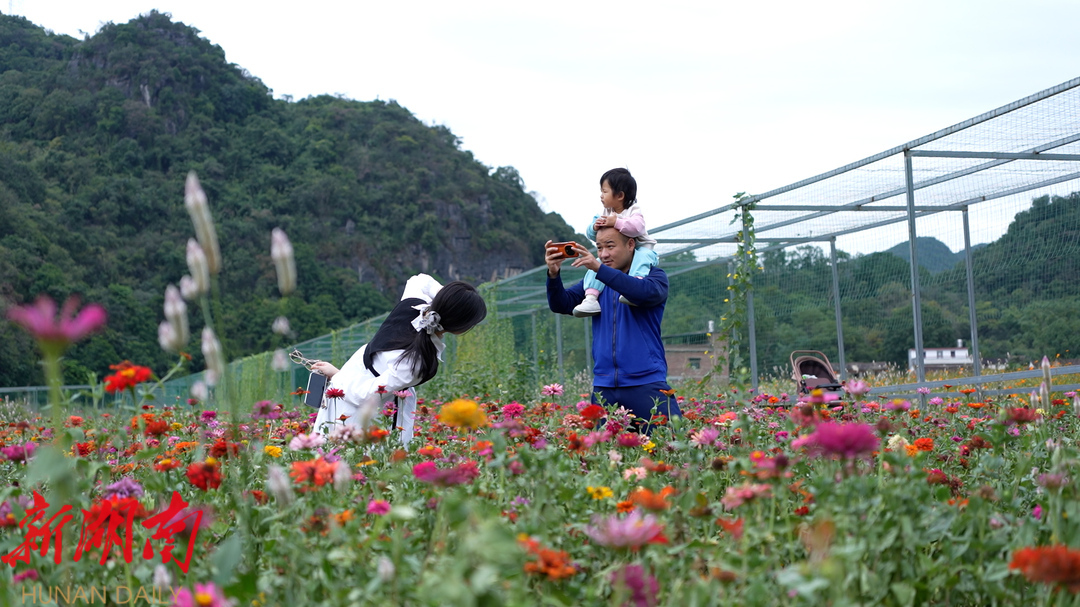 走进勾蓝瑶寨花田中,延绵不断的花田美景尽收眼底,百日草、千日紫、硫华菊、鸡冠花等竞相绽放,耀眼夺目,演绎别样的多彩秋景。游客们徜徉在花田中,微风拂过,花朵轻轻摇曳,令人陶醉。游客们或三五成群,或两两相伴,在花海中穿梭拍照、徜徉漫步、载歌载舞,体验瑶山别样魅力,感受近在眼前的诗和远方。