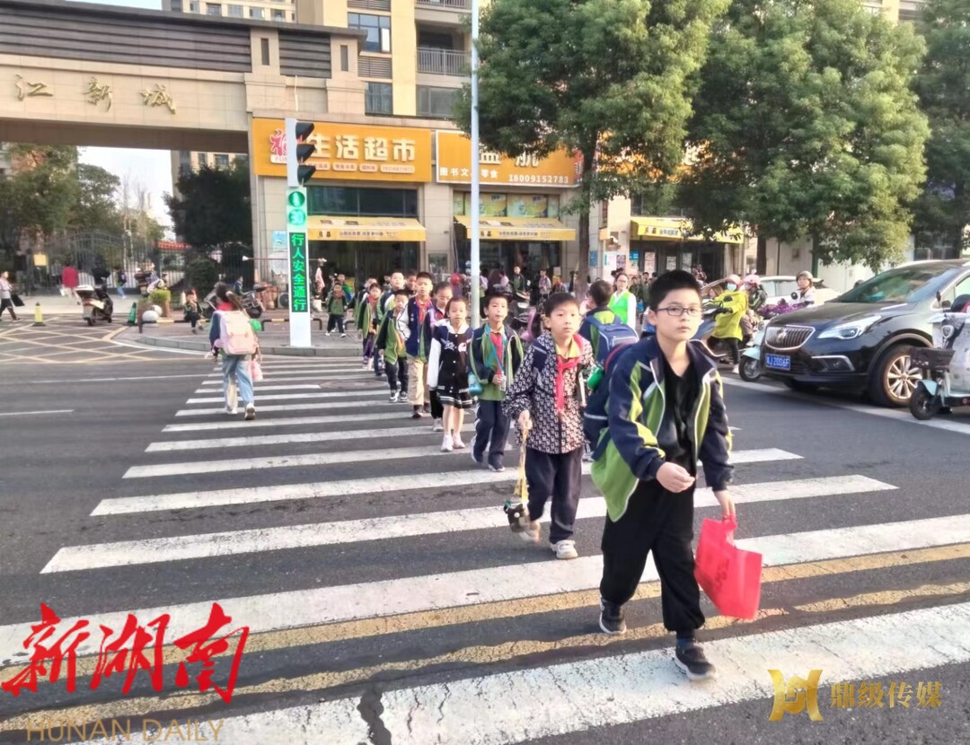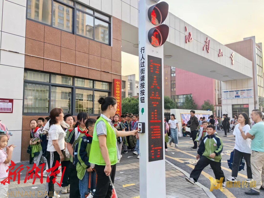 湖南日报·新湖南客户端 10月11日讯(通讯员 何梓涵)“马上就是绿灯了,同学们排好队!”10月10日,在常德市鼎城区江南小学校门口的人行横道处,一位护校家长按下了新安装的“请求式过街信号灯”的“请求键”,数秒后,信号灯转换为绿灯,过往车辆按下了“暂停键”,学生和家长们依次通过。