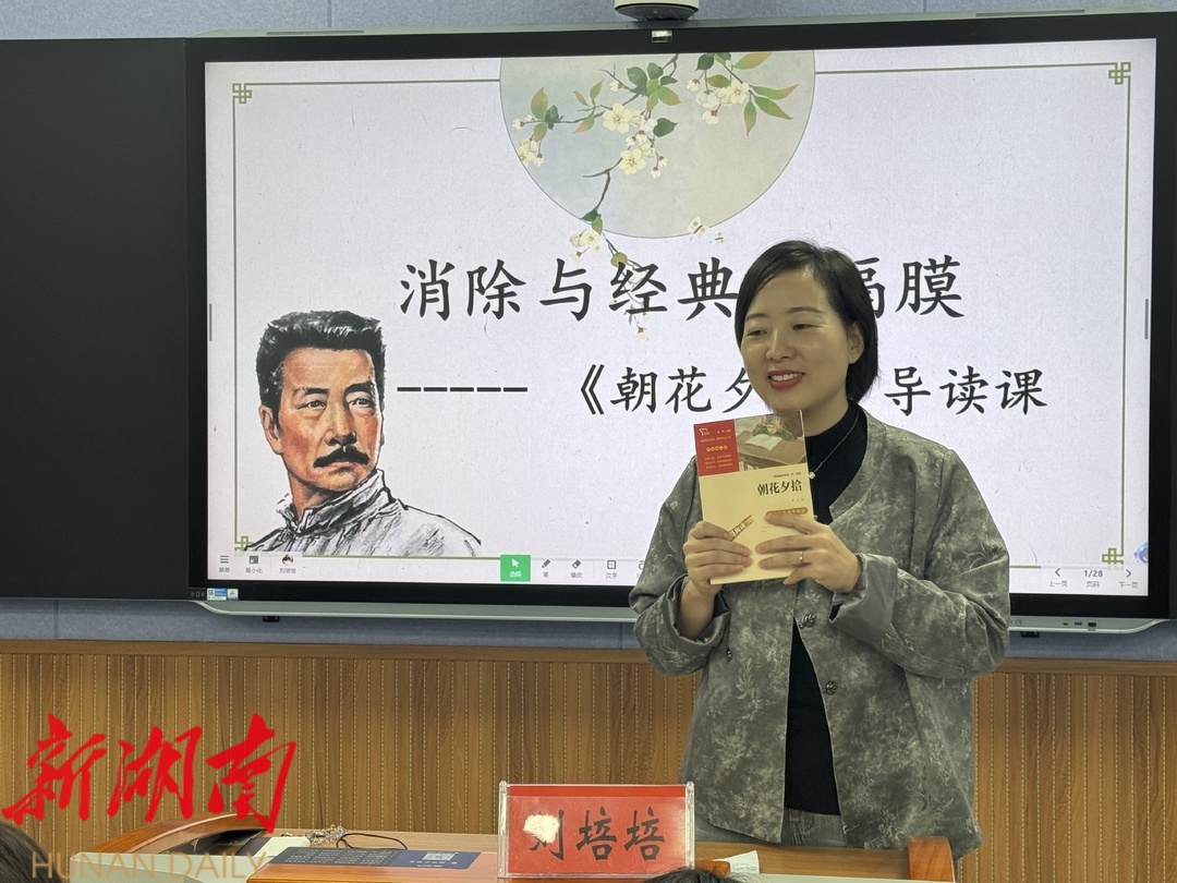 11日上午,研修活动正式拉开帷幕。吉首市雅溪中学的刘培培老师为参训教师们带来了一堂精彩的示范展示课——“消除与经典的隔膜:《朝花夕拾》导读课”。刘老师以文本为核心,巧妙运用单元整体结构化教学的新模式,引导教师们深入探讨《朝花夕拾》的内涵与价值,激发了参训教师们的热烈讨论和深度思考。