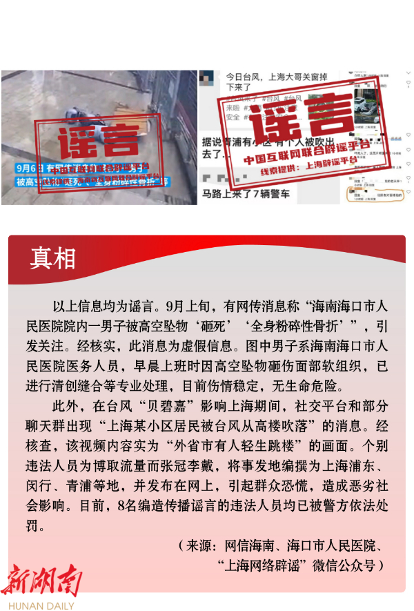 炒作灾害事故制造焦虑。 9月,台风“摩羯”“贝碧嘉”接连来袭,全国多地灾情严峻;安徽、新疆等部分地方发生地震,威胁民众生命财产安全。个别自媒体和网民为博取关注、吸引流量,或夸大其词,或张冠李戴,或移花接木,借机编造发布“台风天海南有医务人员被砸死”“上海有人因台风被吹落高坠”“广东某石材城牌坊被台风吹倒”“台风‘摩羯’致广西多地‘一片狼藉’”等不实信息,引发群众恐慌,造成不良社会影响。谣言“合肥肥东地震导致高层住宅出现裂缝”系拼接剪辑视频而成,蓄意歪曲事实;“重庆市沙坪坝区突发7级地震”则纯属子虚乌有。此外,一些网民刻意杜撰并扩散“一冷藏车里发现15名被拐儿童”“重庆江北观音桥抓人贩子”“人贩子到广西贵港市中心抓人”等严重失实的涉公共安全类谣言,蓄意制造焦虑,扰乱社会秩序。