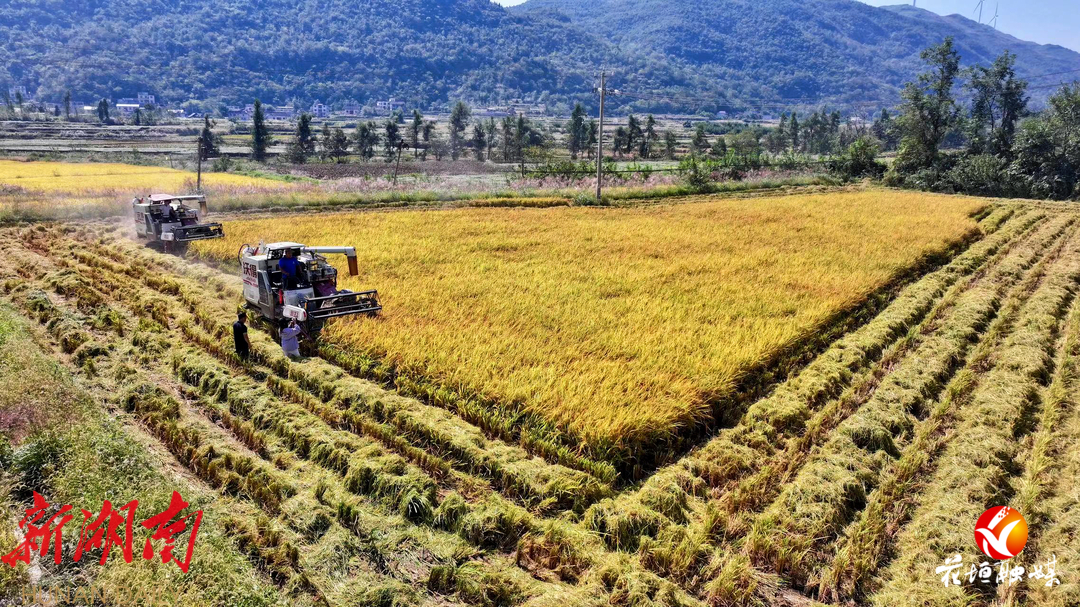 利用收割机收割水稻