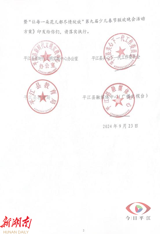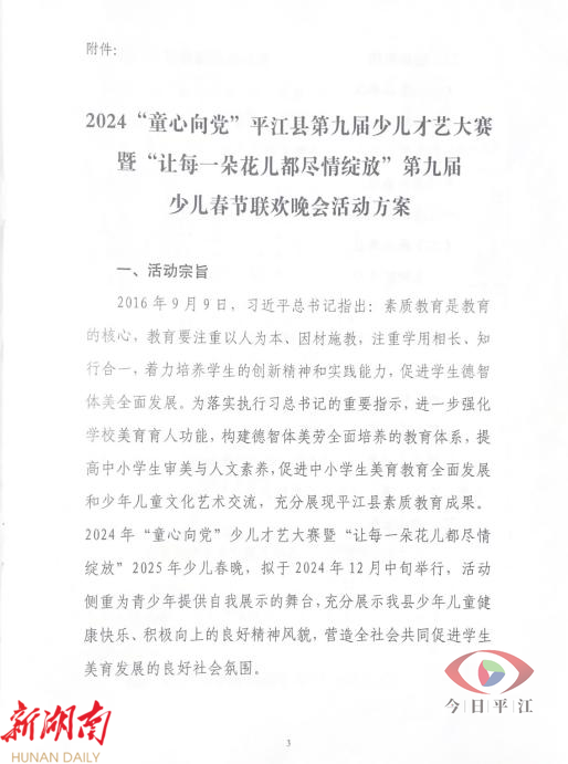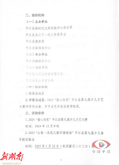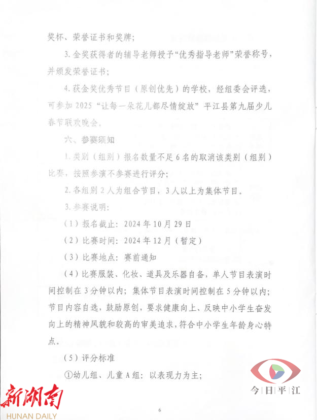 4. 获金奖优秀节目(原创优先)的学校,经组委会评选,可参加2025“让每一朵花儿都尽情绽放”平江县第九届少儿春节联欢晚会。