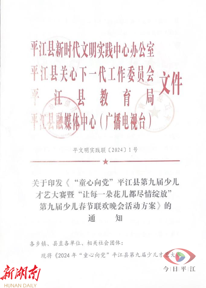 为深入学习贯彻习近平新时代中国特色社会主义思想,庆祝新中国成立75周年,加强对青少年及儿童的美育教育,培养和提升学生健康的艺术审美情趣和综合素质,充分展示我县中小学生健康向上的艺术才华和精神风貌,提高中小学生审美与人文素养,促进中小学生美育教育全面发展和少年儿童文化艺术交流,充分展现平江县素质教育成果。时隔五年,平江县2024年“童心向党”平江县第九届少儿才艺大赛暨“让每一朵花儿都尽情绽放”第九届少儿春节联欢晚会重新回到大众视野。