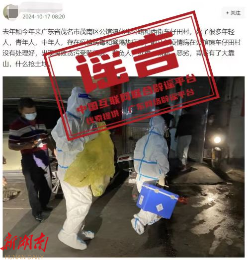 真相: 10月17日,网上出现几张医护人员身穿防护服进行路面消毒的图片,并配文“去年和今年来茂南区某地死了很多年轻人,青年人,中年人,存在疫情病毒和登革热病毒”,引发社会关注。经广东网信部门核实,该帖文系黄某在网络上截取图片并编造内容。目前,违法行为人黄某因散布谣言的行为涉嫌故意扰乱公共秩序,被广东省茂名市公安局茂南分局依法处以行政拘留5日处罚。(来源:“广东省互联网举报中心”微信公众号)