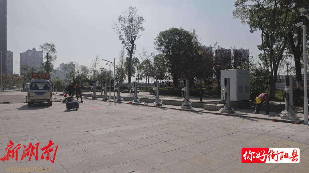 在体育公园充电站,8座新能源充电桩已安装完毕,工人们正在加紧安装防撞护栏、道闸及铺设路面沥青。这座充电站位于蒸阳大道旁,人流集中、车流量大,方便市民充电的同时也加快了新能源汽车的推广应用。
