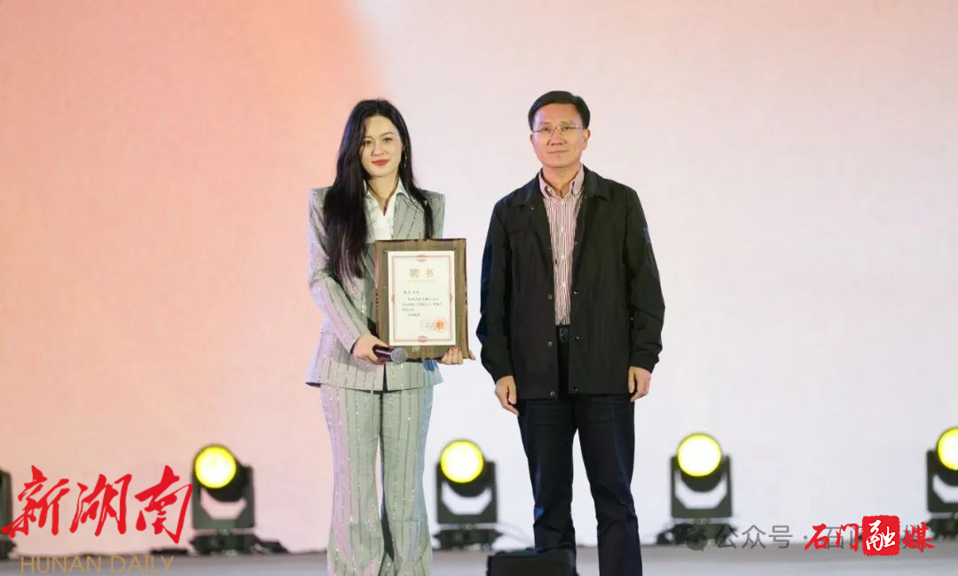 常德市政协副主席朱金平为歌手唐艺授予石门县助农大使证书。