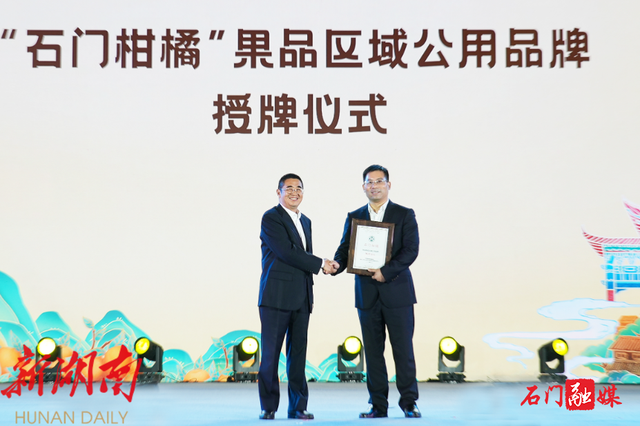 中国果品流通协会会长鲁芳校为石门县颁发“柑橘果品区域公用品牌价值”牌匾,县委副书记、县长李长春代表县人民政府接牌。