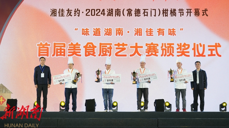 省市场监督管理局副局长吴峰、副市长黎军锋现场为“味道湖南·湘佳有味”首届美食厨艺大赛一等奖获得者颁奖。