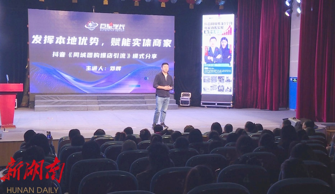 会上,湖南巨星 学长品牌运营管理有限公司创始人、总经理邓辉分享了其公司抖音同城团购、培训咨询案例以及全国单店线上爆破案例,并围绕抖音商业化关键词如何通过“付费”实现确定性增长、实体商家如何做好“短视频+投放”、实体商家如何联动冷水江融媒做好“城市直播间”等方面内容进行了精彩讲解,为现场100余家商户带来了一场关于本地生活服务的知识盛宴。
