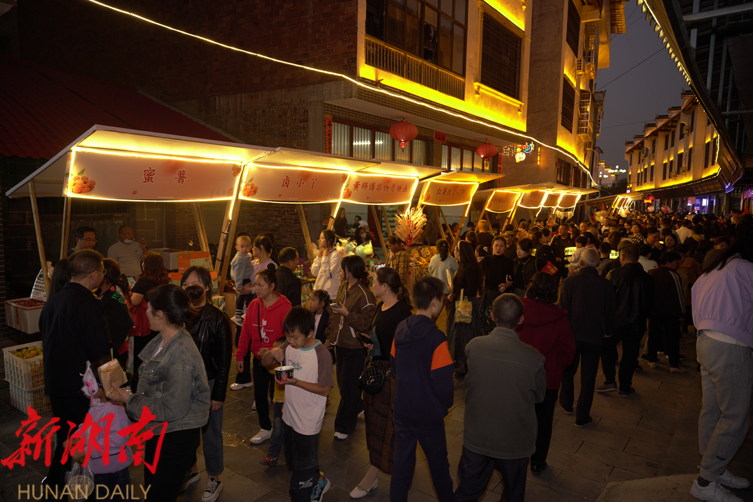 新洞口客户端10月26日讯 (记者:王禹 邓贝乐) 10月25日晚,高沙古镇举行"文润洞口 星光高沙"系列活动。记者在现场看到,丰富多彩的活动吸引了大批游客前来游玩打卡,看非遗、逛夜市、品美食、赏美景,"夜经济"火爆拉满。