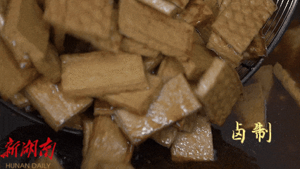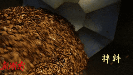 第七步:拌料。新鲜出炉的传统手工酱干 是豆香、卤香、烤香的复合体, 酱干工厂会根据人们的喜爱, 给传统酱干配上辣椒油、 孜然粉、五香粉等调味料, 色、香、型俱佳的平江酱干,就诱人地呈现大家的面前了。