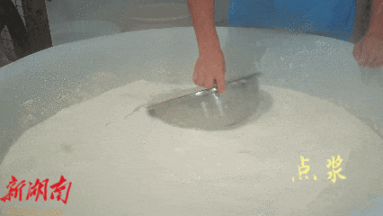 第四步:酸浆点浆,利用黄浆水自然发酵, 产生的乳酸进行点浆, 含有多种微生物和酶, 能够促进豆浆凝固成型, 化身为豆腐脑, 也使其软糯中更带嚼劲。