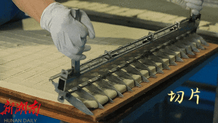 第五步:压榨与切分,将凝固好的豆腐脑填入膜具中, 进行浇注、包布, 经过一端时间的压榨后, 取出干燥豆腐干,进行冷却, 待其冷却完毕,再进行切分与摆块。